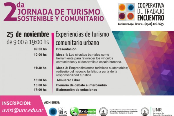 La Secretaría de Extensión Universitaria (SEU) de la Universidad Nacional de Rosario (UNR) los invita a participar de la “2da Jornada de Turismo Sostenible y Comunitario”, el día martes 25/11 en la sede de la Cooperativa de Trabajo Encuentro, Corrientes 474 de la ciudad de Rosario. Este encuentro es realizado por dicha organización social, en conjunto con la ONG Internacional “Fondo Verde”, y cuenta con la colaboración de la SEU y del Postgrado en Empresas y Emprendimientos Turísticos de la Facultad de Cs. Económicas y Estadísticas de la UNR.