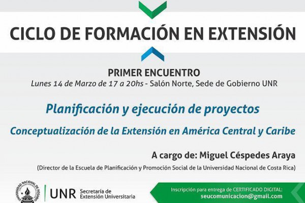 FORMACIÓN EN EXTENSIÓN: La Secretaría de Extensión Universitaria (S.E.U.) de la Universidad Nacional de Rosario (U.N.R.) informa que el lunes 14 de marzo se llevará a cabo el primer encuentro del Ciclo de Formación en Extensión 2016 a cargo del docente costarricense Miguel Céspedes Araya quien abordará la temática de la planificación y ejecución de proyectos. El mismo tendrá lugar en el Salón Norte de la Sede de Gobierno de la UNR, Maipú 1065 de 17 a 20 horas.