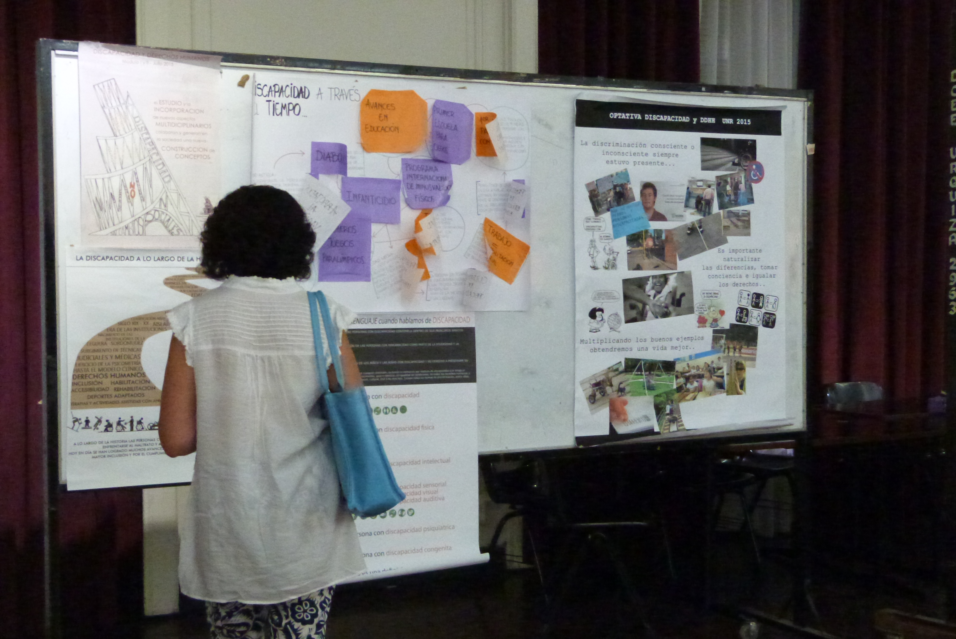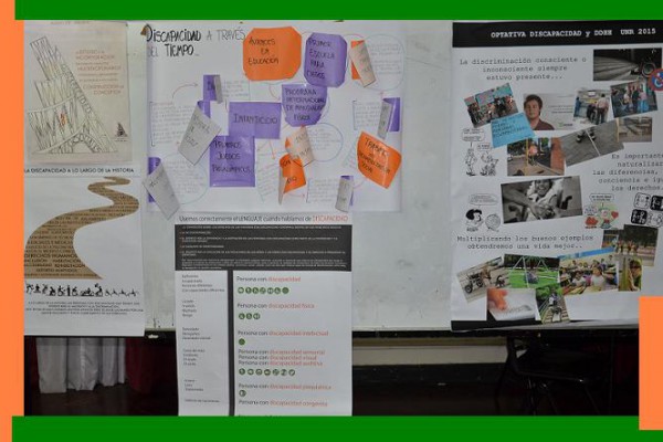 A partir de la conformación de grupos heterogéneos (integrado por estudiantes de diferentes carreras), éstos elaboraron posters mediante distintos modos de expresión (dibujos, gráficos, palabras…) y producciones escritas donde pudieron dar cuenta de los conceptos desarrollados durante el cursado de la materia. La heterogeneidad fue una fortaleza para la investigación, el análisis, la reflexión sobre la problemática de la discapacidad desde diferentes perspectivas.