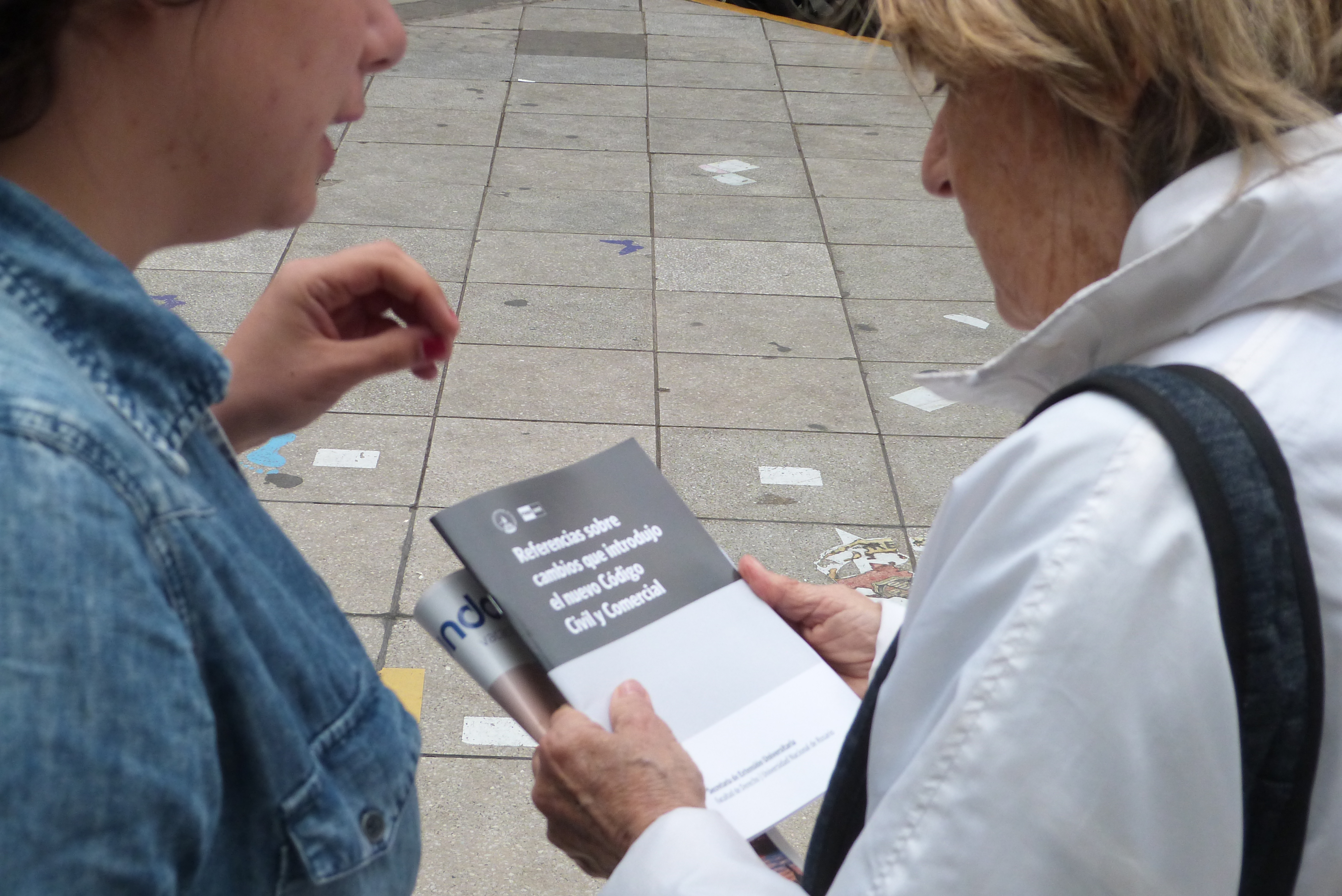 Por Florencia Fernández*. La Facultad de Derecho se hizo protagonista en la transitada esquina rosarina de Córdoba y Paraguay para acercar a la comunidad una Revista titulada “Referencias que introdujo el Nuevo Código Civil y Comercial”. En el marco de la Semana de Extensión 2015, organizada conjuntamente por la Secretaría de Extensión Universitaria y el Consejo Asesor de Extensión Universitaria de la UNR, la Secretaria de Extensión Ma. Emilia Barberis contó los objetivos del encuentro en la céntrica esquina rosarina.