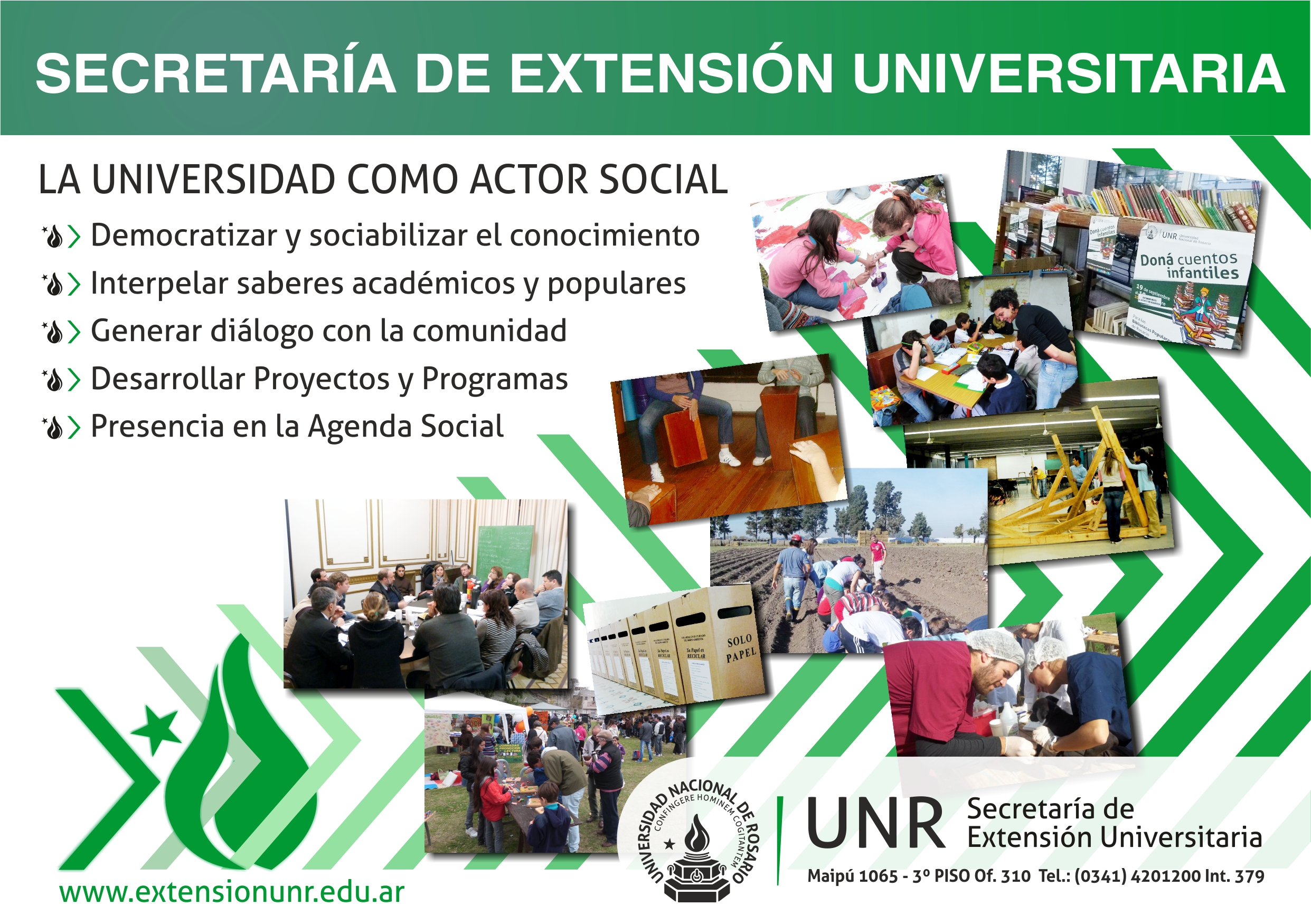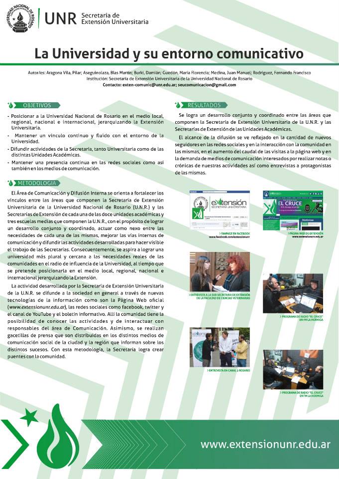 Si bien el Área de Comunicación y Difusión Interna se orienta a fortalecer los vínculos entre las áreas que componen la S.E.U. de la Universidad Nacional de Rosario y las Secretarías de Extensión de cada una de las doce unidades académicas y tres escuelas medias que componen la U.N.R., con el propósito de lograr un desarrollo conjunto y coordinado, actuar como nexo entre las necesidades de las mismas, mejorar las vías internas de comunicación y difundir las actividades desarrolladas para hacer visible el trabajo de las Secretarías, también se ocupa de la relación tripartita Universidad-Extensión-Comunidad.