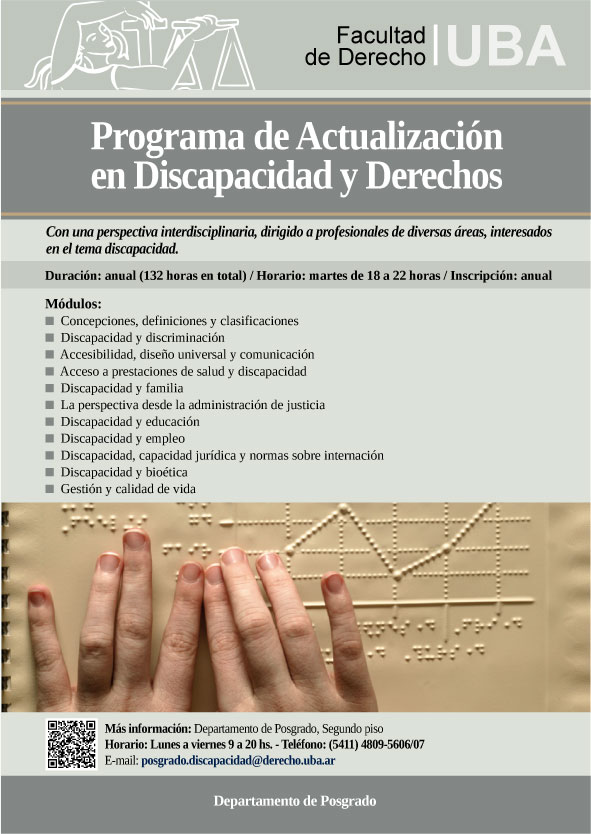 El Área de Integración e Inclusión de personas con Discapacidad dependiente de la Secretaría de Extensión Universitaria invita a participar del Programa de Actualización en Discapacidad y Derechos que organiza el Departamento de Posgrado de la Facultad de Derecho de la Universidad de Buenos Aires.
