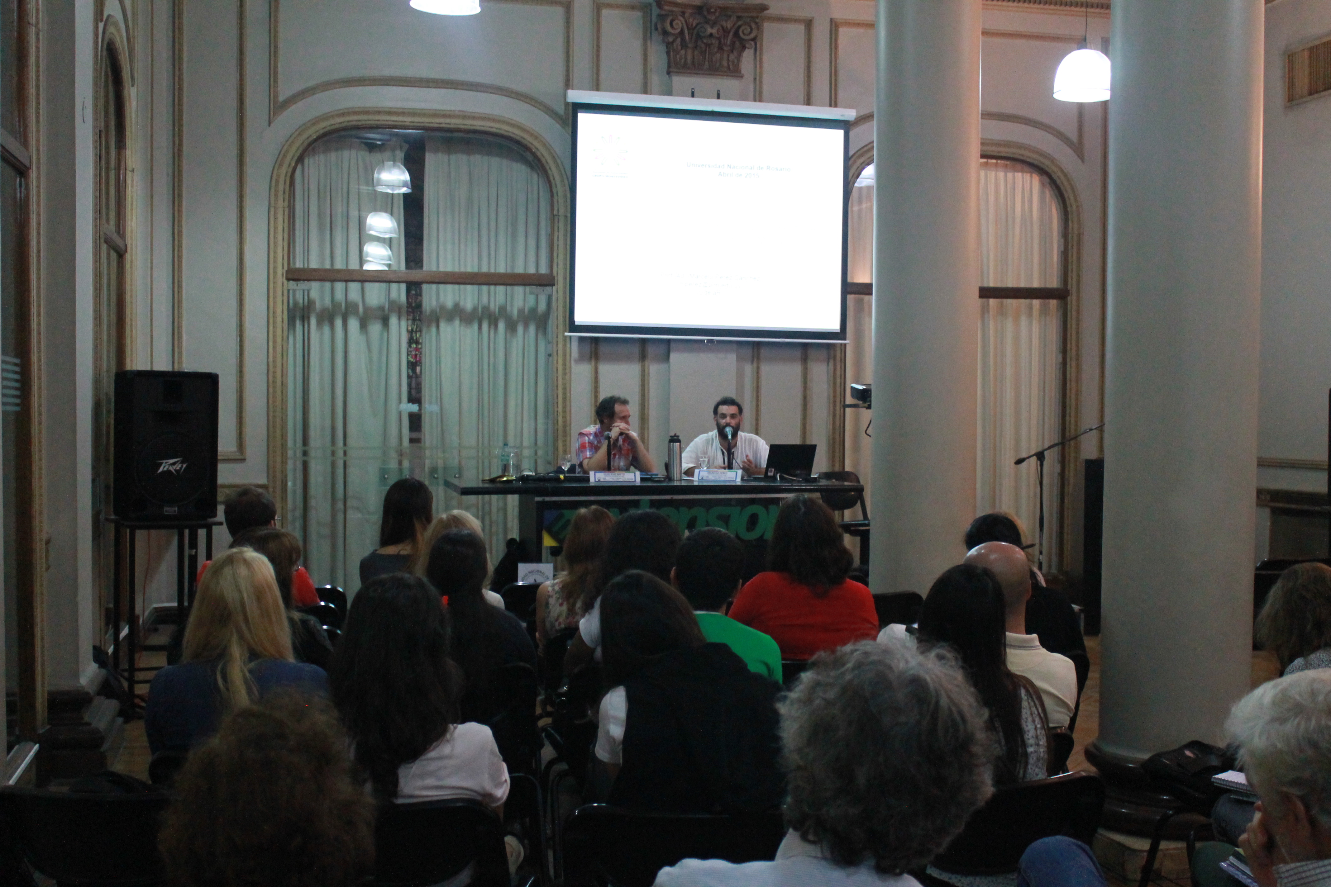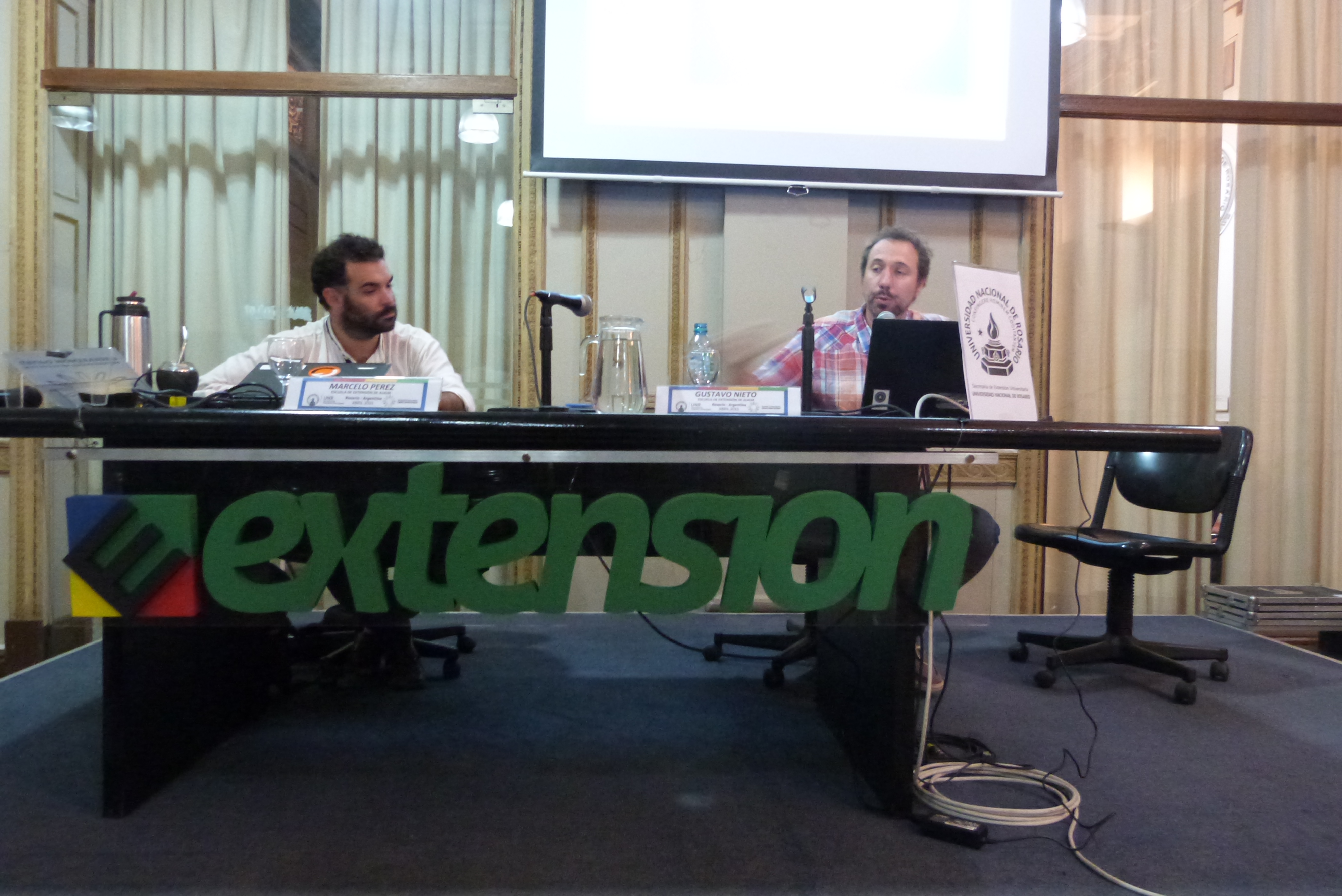 Para comenzar la jornada, el Licenciado en Comunicación Social Gustavo Nieto, proveniente de la Universidad Nacional de Cuyo, acompañado por el Magister Marcelo Pérez de la Universidad de La República de Uruguay, dieron la bienvenida a los presentes, en su mayoría docentes y estudiantes. La dinámica de trabajo dio inicio con la presentación de los asistentes quienes bajo una ingeniosa forma: contaron en el tiempo que duraba encendido un fósforo, quiénes son y sus participaciones en proyectos de extensión universitaria.