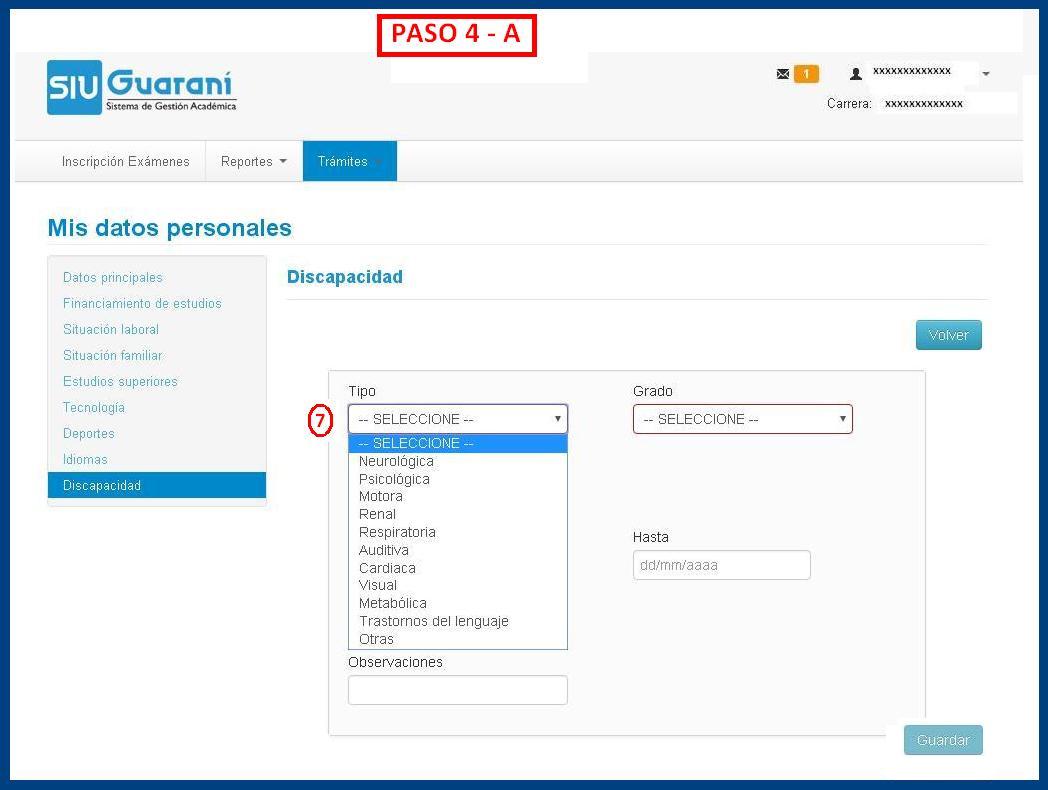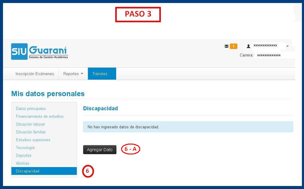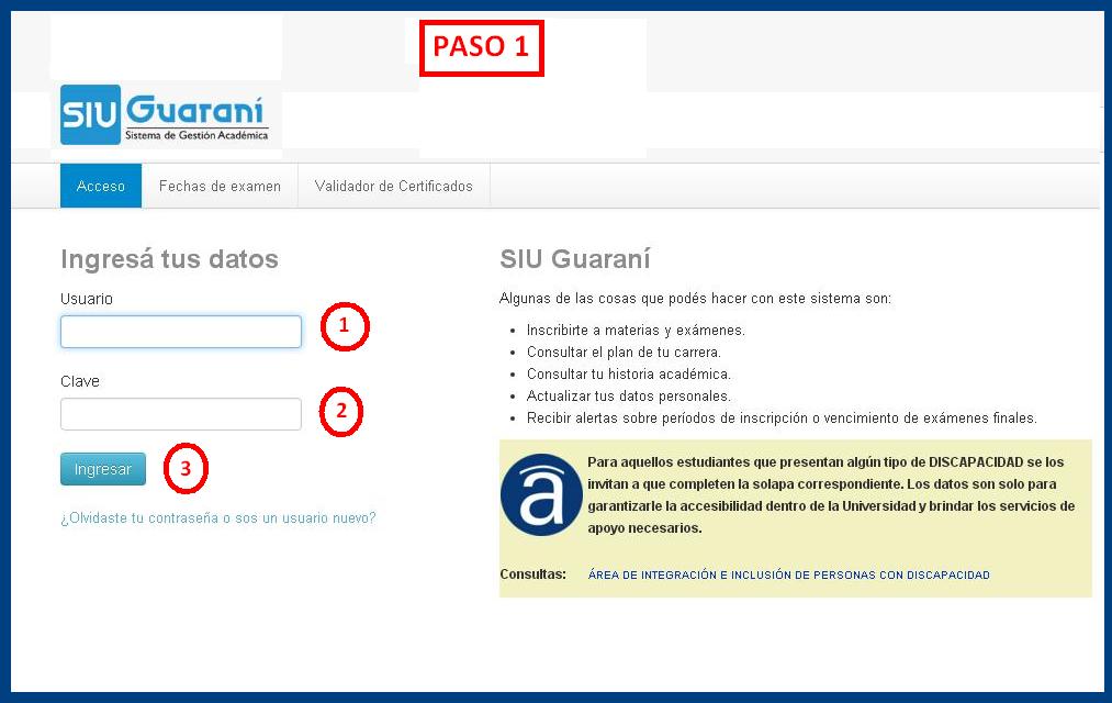 COMO ENTRAR LOS DATOS AL SISTEMA: Desde el presente ciclo lectivo la Dirección de Guaraní por iniciativa de la Comisión Universitaria de Discapacidad coordinada por el Área de integración e inclusión de personas con discapacidad (SEU), realizó modificaciones en el mencionado modelo de gestión académica ya que a aquellos estudiantes que presentan algún tipo de discapacidad se los invitan a que completen la solapa correspondiente en el SIU-Guaraní. Los datos son solo para garantizarle la accesibilidad dentro de la Universidad y brindar los servicios de apoyo necesarios.