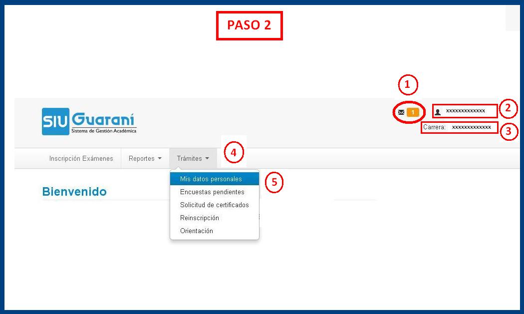 A modo de información, en el extremo superior derecho de la pantalla aparecerá el NOMBRE DEL ESTUDIANTE (2) junto al icono referencial que es un menú desplegable en donde se encuentran las opciones de personalización y cerrar. Por debajo del mismo la CARRERA que se encuentra cursando (3) el alumno. Además a la izquierda del nombre aparece el ícono de mensajes con la cantidad de comunicaciones directas que tiene cada estudiante.