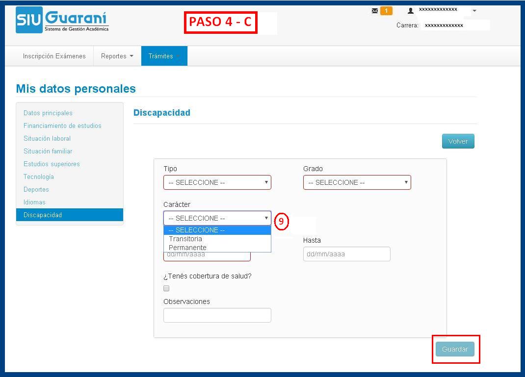 En el cuadro de texto seleccione el CARÁCTER (9) de discapacidad, despliegue el rectángulo de texto y aparecerán las opciones. Parece con el curso del mouse o telcas de desplazamiento sobre la indicada y cliquee o dar entre sobre ella y la misma quedará seleccionada. Si no desea realizar otra elección haga click o presione en GUARDAR que se encuentra en el margen derecho, extremo inferior de la página.