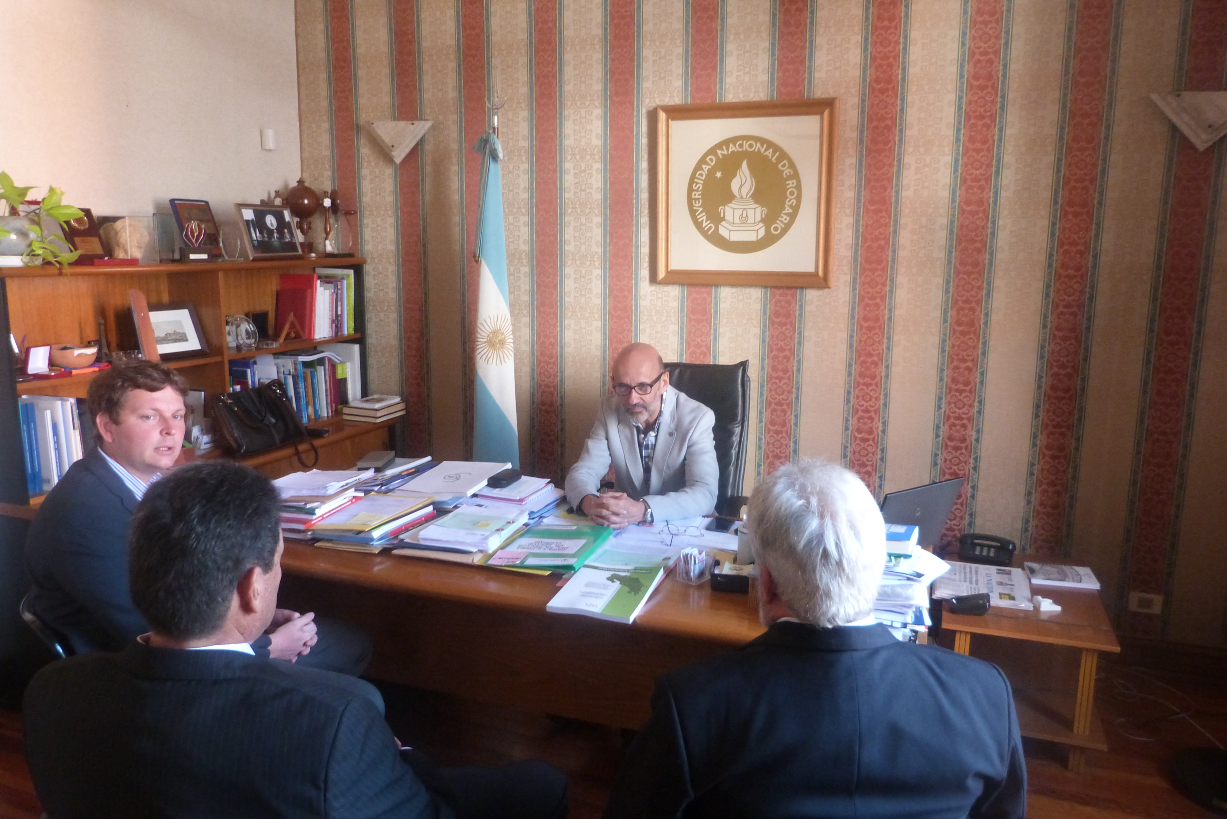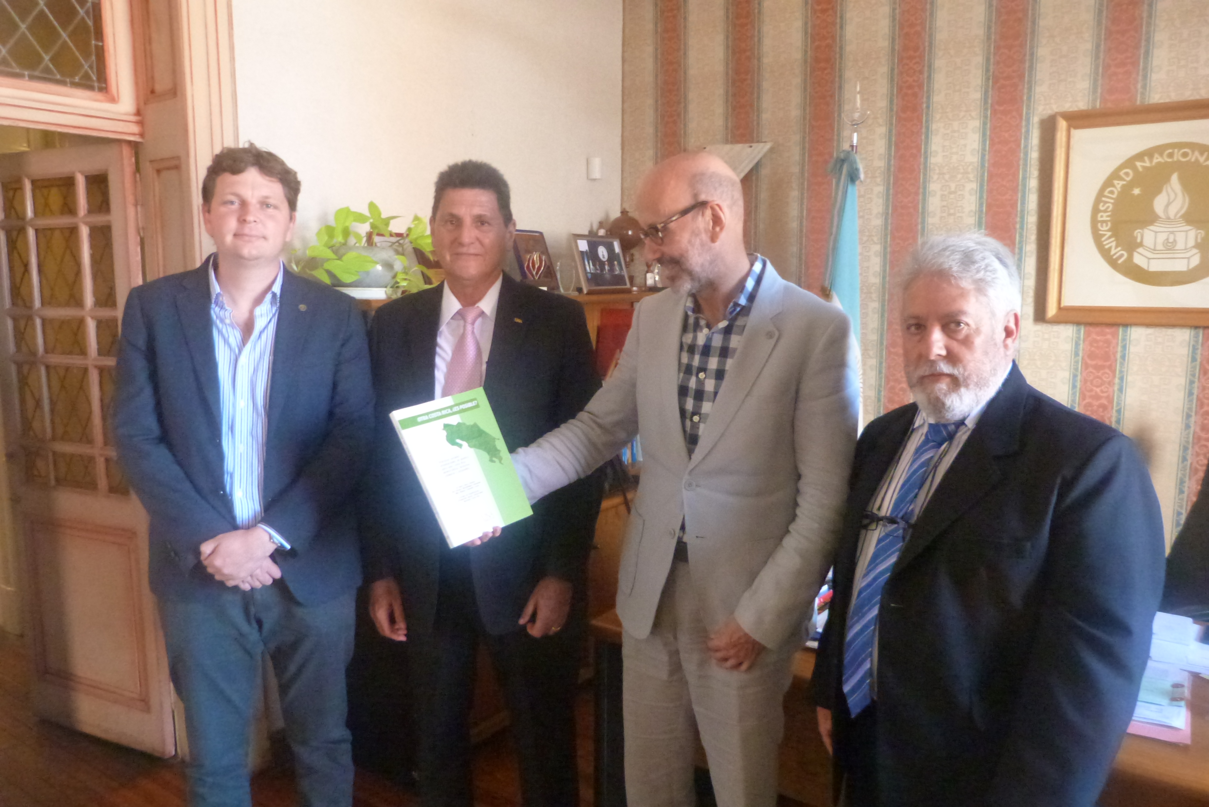 VISITA: Este martes 15 de marzo Miguel Céspedes Araya, Director de la Escuela de Planificación y Promoción Social y Richart Maradiegue Ontaneda, coordinador de la Maestría de Planificación Económica y Social de la Universidad Nacional de Costa Rica (UNA) visitaron a la máxima autoridad de la Universidad Nacional de Rosario (UNR) en compañía del secretario de Extensión Ingeniero Juan Manuel Medina. En el encuentro los académicos centroamericanos hicieron entrega del libro “Otra Costa Rica, ¿es posible?” que presentarán en la Sede de Gobierno de la universidad.