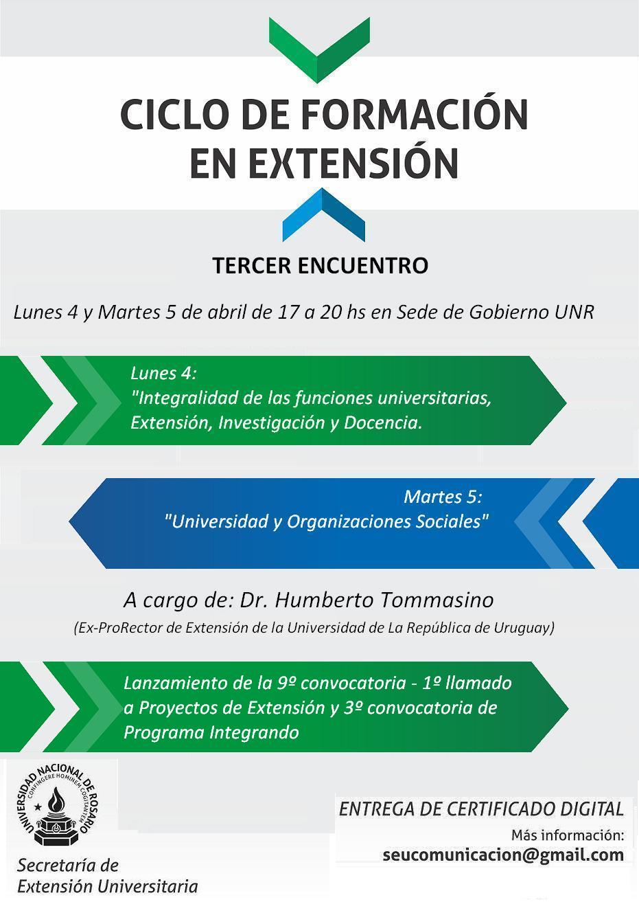 Desde la Secretaría de Extensión Universitaria de la Universidad Nacional de Rosario, los invitamos a participar del 3º Encuentro del Ciclo de Formación de Extensión, que se llevará a cabo los días lunes 4 en el Salón Sur y martes 5 de abril en el Salón Norte de 17:00 a 20:00 hs en la Sede de Gobierno, Maipu 1065 de la ciudad de Rosario. Se entregarán certificados de asistencia.