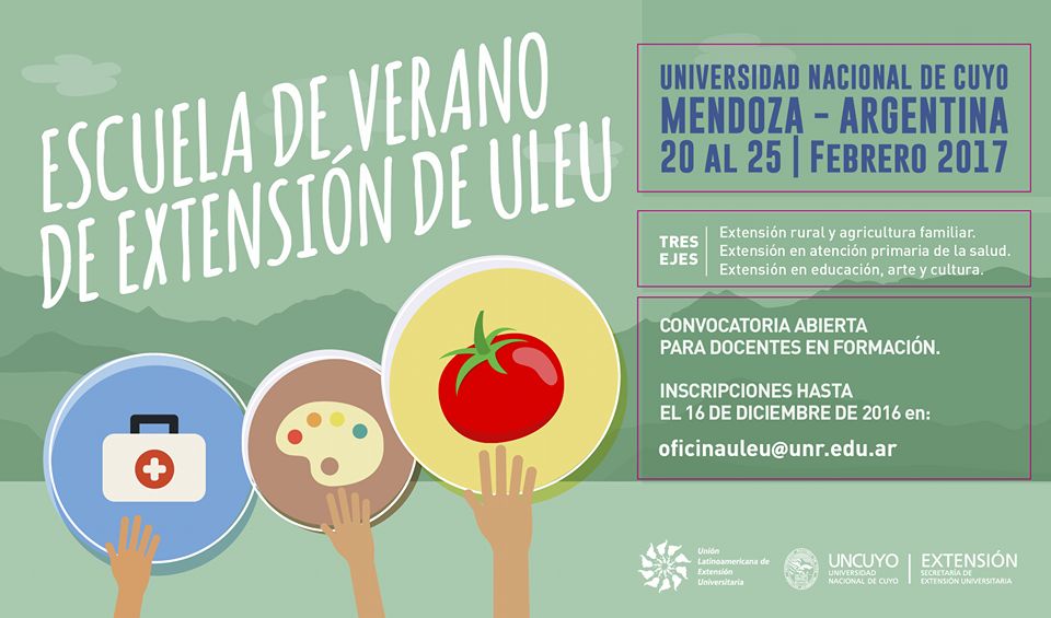 Será con la “Escuela de verano de Extensión de ULEU”. Abierta la Inscripción hasta el 16 de diciembre. Del 20 al 25 de febrero de 2017 se realizará la Escuela de Verano de Extensión de la Unión Latinoamericana de Extensión Universitaria (ULEU) en la Universidad Nacional de Cuyo (UNCUYO), ubicada en la ciudad de Mendoza, Argentina.