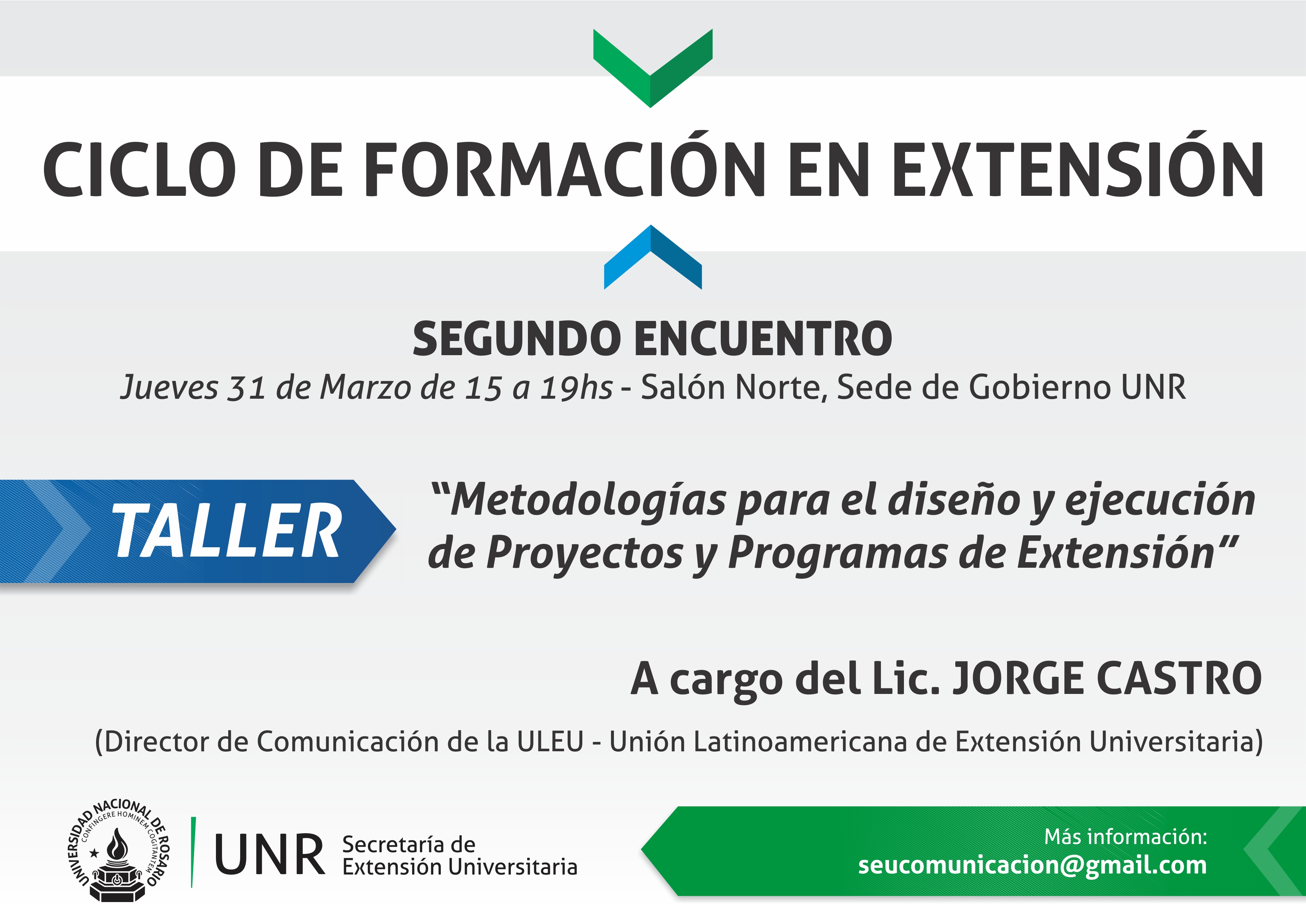 CAPACITACIÓN: La Secretaría de Extensión Universitaria (S.E.U.) de la Universidad Nacional de Rosario (U.N.R.) informa que se llevará a cabo el segundo encuentro del Ciclo de Formación en Extensión 2016 a cargo del docente Jorge Castro quien abordará en formato de taller las metodologías para el diseño y ejecución de Proyectos y Programas de Extensión.