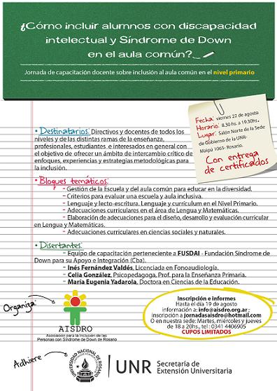 La Secretaría de Extensión Universitaria de la UNR adhiere a las “Jornadas Educativas sobre Cómo incluir a niños con discapacidad intelectual y Sindrome de Down al aula común” organizadas por la Asociación para la Inclusión de personas con Síndrome de Down en Rosario (AISDRO) el día viernes 22 de agosto de 2014 en el Salón Norte de la Sede de Gobierno de la UNR, Maipú 1065.