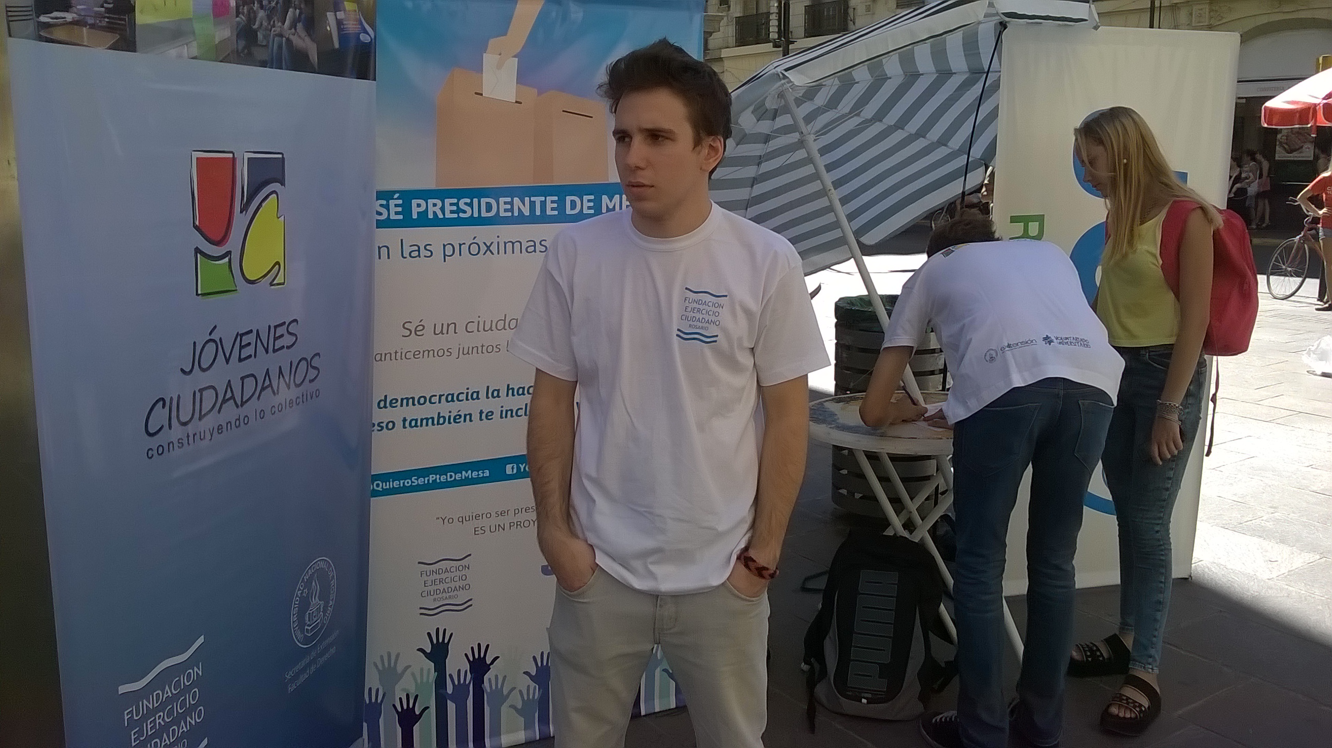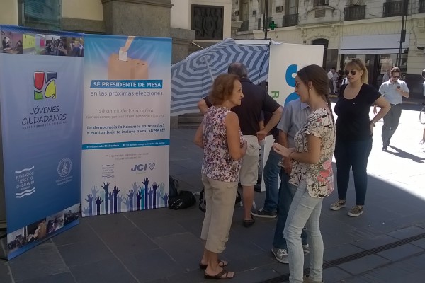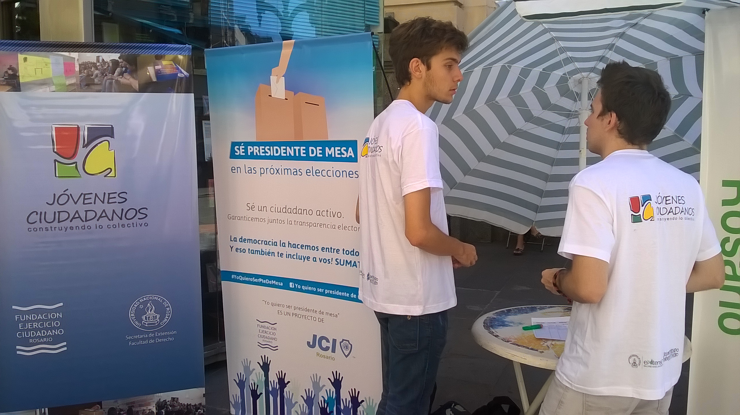 CAMPAÑA CALLEJERA: El grupo de Jóvenes Ciudadanos, surgida del Proyecto de Extensión “Los jóvenes y la política” radicado en la Facultad de Ciencia Política y RR.II. y financiado por la Secretaría de Extensión Universitaria de la UNR en el marco de la 6º convocatoria y de la 8° convocatoria de Voluntariado Universitario, participo de la campaña ciudadana “Yo Quiero ser Presidente de Mesa” (#YoQuieroSerPteDeMesa),” una acción que apunta a garantizar una democracia más participativa y comprometida por parte de los ciudadanos” como cuentan fuentes del proyecto y organizada por Fundación Ejercicio Ciudadano y la Organización Civil JCI Rosario.