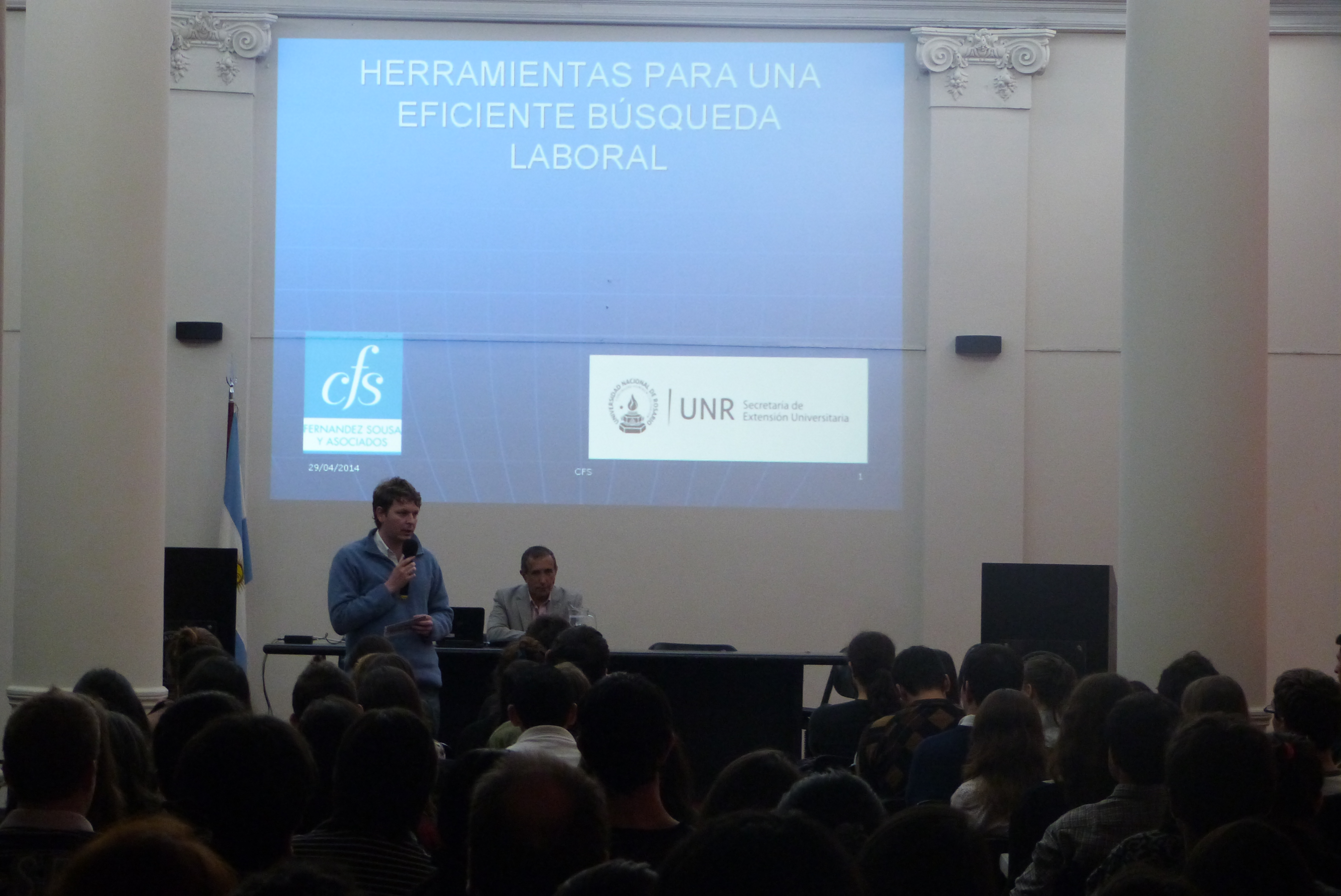 Alrededor de 250 jóvenes, mayoritariamente estudiantes con un promedio de edad de 22 años, se dieron cita en el Salón Norte “Rector Ricardo Suárez” para presenciar la clase abierta brindada por quien es además docente de la cátedra de “Legislación y Relaciones del Trabajo” de la Facultad de Ciencias Exactas, Ingeniería y Agrimensura de la UNR. En ella Fernández Sousa abordó temáticas generales inherentes a la búsqueda laboral. Entre las que se pueden destacar: elaboración correcta de un Curriculum Vital y una carta de presentación, cómo realizar un proceso de búsqueda laboral de manera eficiente y cómo prepararse para una entrevista laboral.