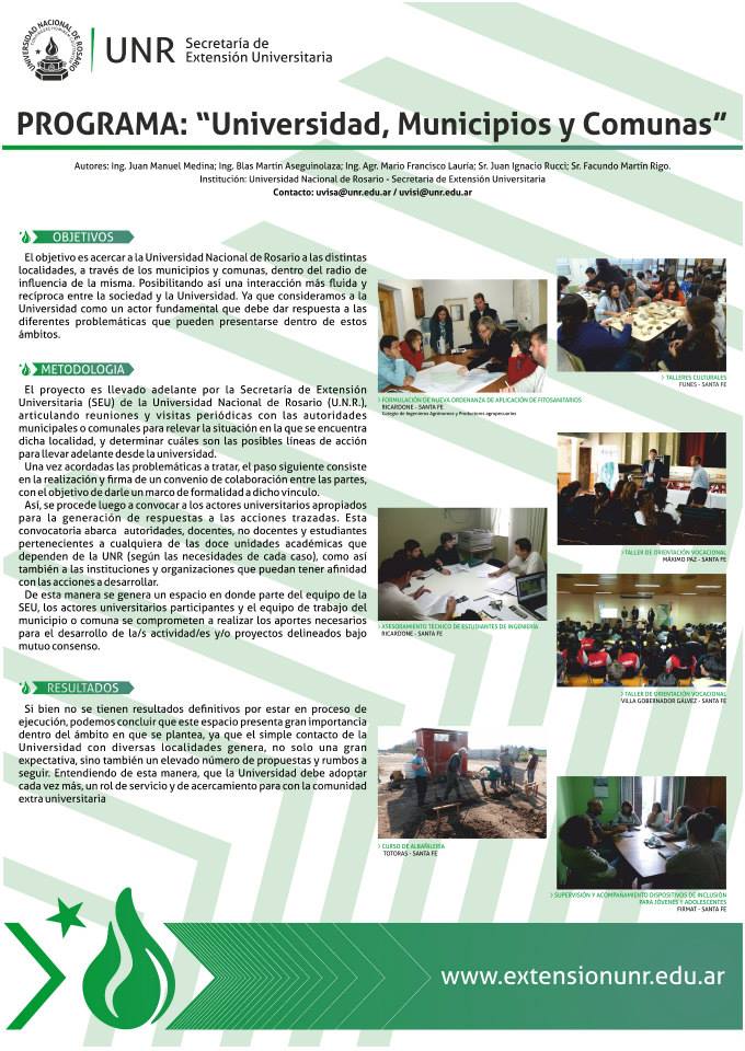 En las Jornadas de Extensión del Mercosur 2014 que se llevan a cabo en la ciudad de Tandil, una de las sedes de la UNICEN (Universidad Nacional del Centro de la Provincia de Buenos Aires), la Secretaría de Extensión Universitaria (SEU) de la UNR presentó el trabajo “Universidad, Municipios y Comunas”, una iniciativa que llevaron adelante conjuntamente las áreas UVISA y UVISI.