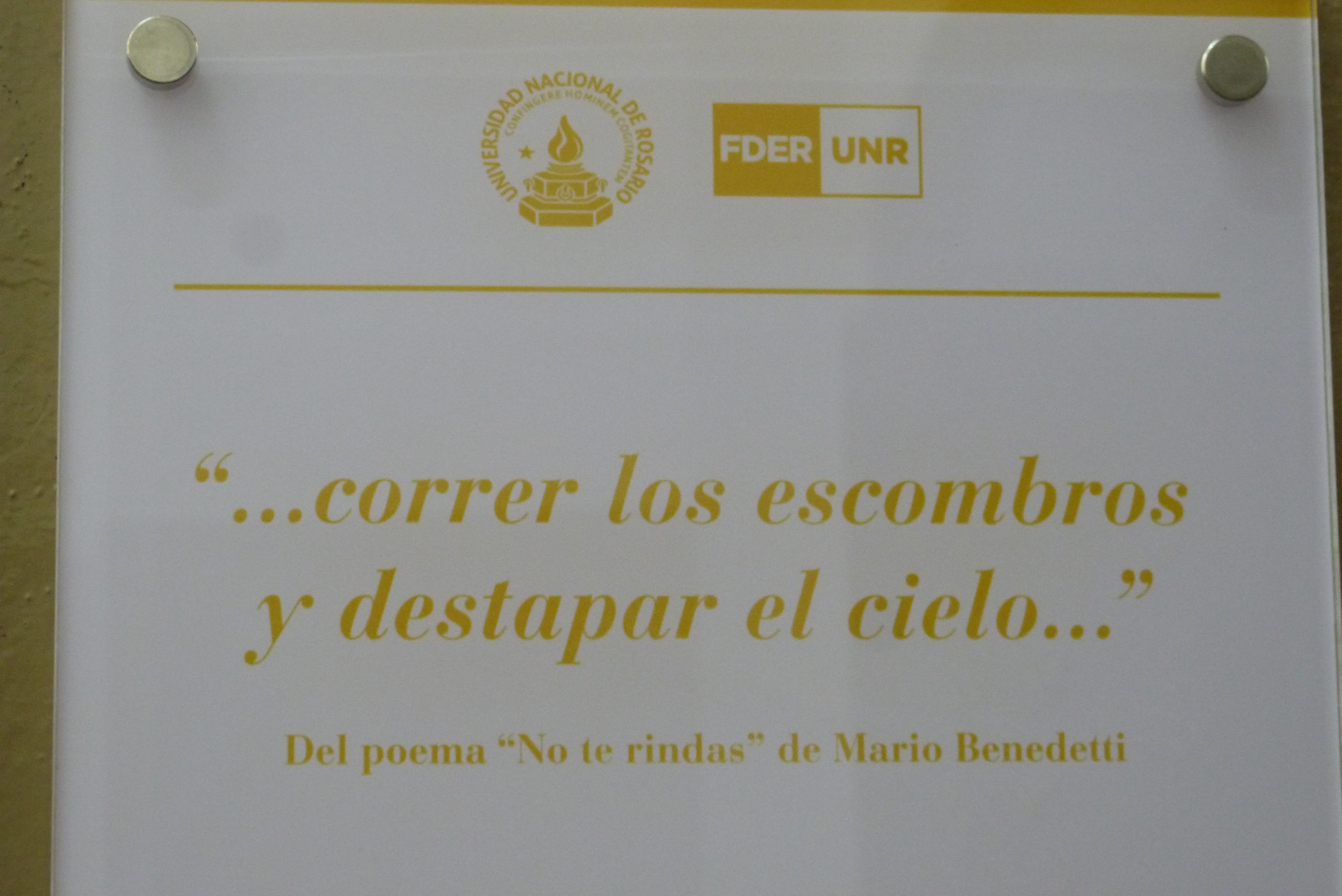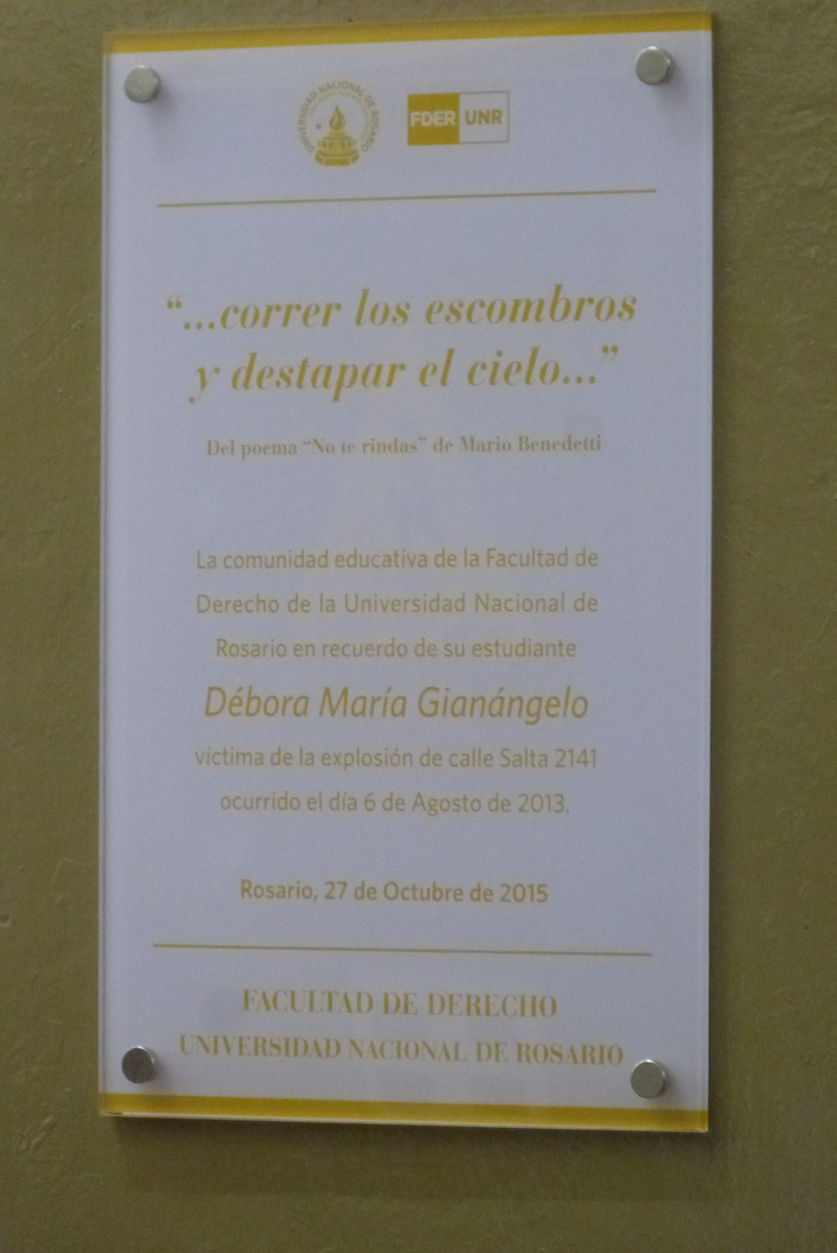 No fue una tarde más en la Facultad de Derecho, ya que desde el martes 27 de octubre el primer pasillo lateral izquierdo cuenta con una placa que recuerda el paso por la Universidad de Débora María Gianángelo, estudiante de Abogacía fallecida en la explosión del edificio de calle Salta 2141, la mayor tragedia de Rosario.