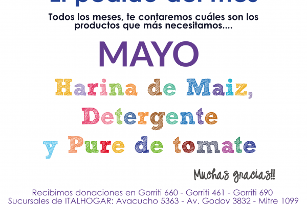 En “El pedido del mes” de Mayo solicitan puedan acercar harina de maíz, detergente y puré de tomates. Estas donaciones pueden ser entregadas en las siguientes direcciones: Gorriti 660, Gorriti 690, Gorriti 461 y también en sucursales de Micropack y sucursales de Italhogar: esto es en Ayacucho 5363, Av. Godoy 3832, Mitre 1099.
