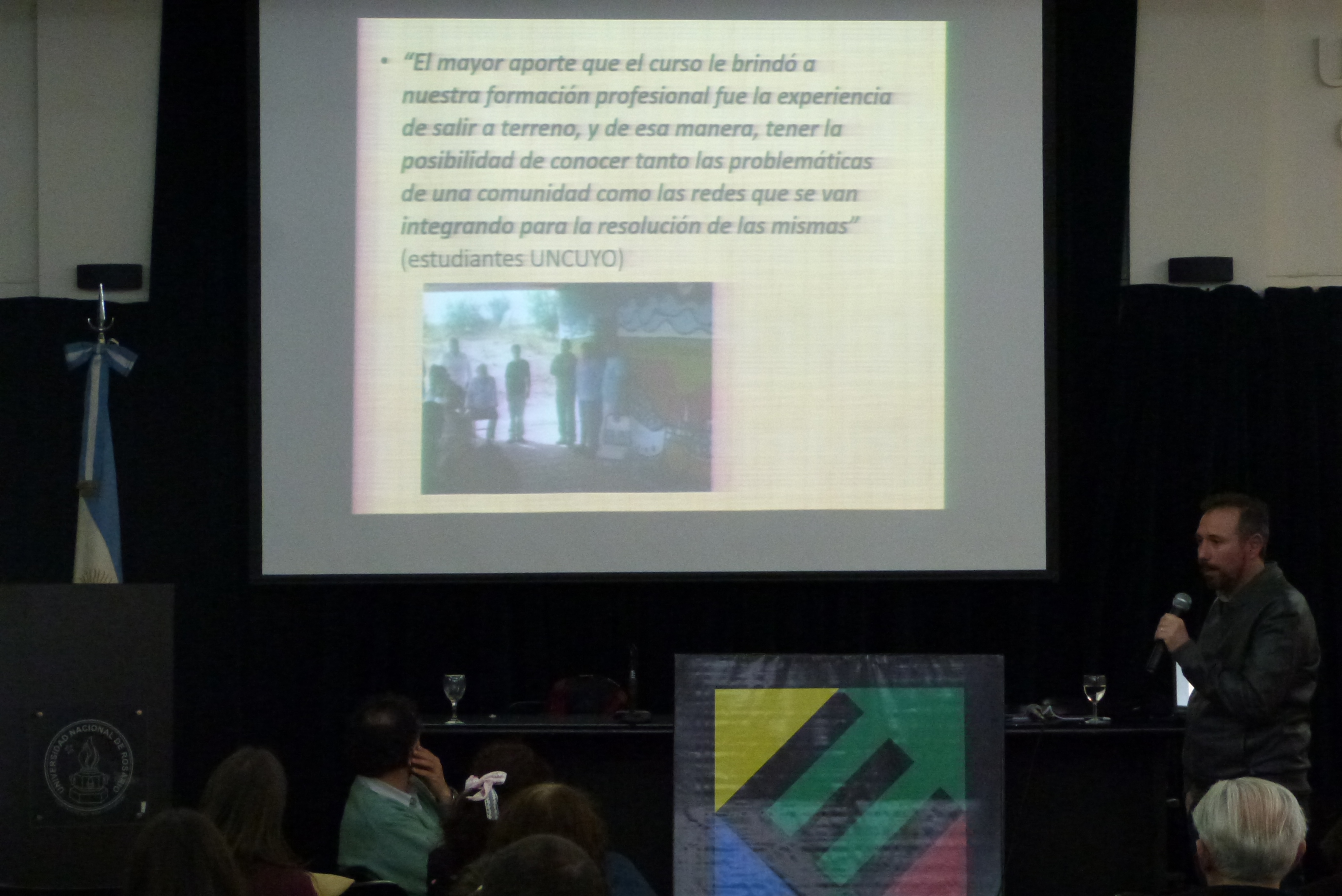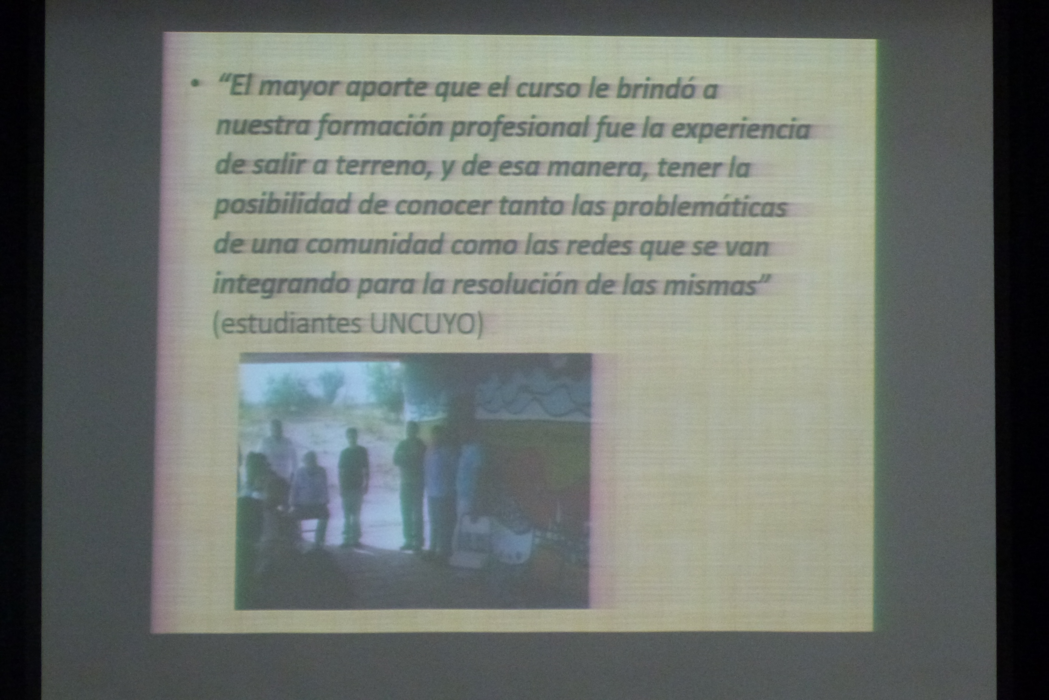 A manera de comentario dejó una reflexión de un estudiante de 6to año de Medicina de la Universidad Nacional de Cuyo luego de un trabajo extensionista en una comunidad ubicada en un desierto en Mendoza: “El mayor aporte que el curso le brindó a nuestra formación profesional fue la experiencia de salir a terreno, y de esa manera, tener la posibilidad de conocer tanto las problemáticas de una comunidad como las redes que se van integrando para la resolución de las mismas”.