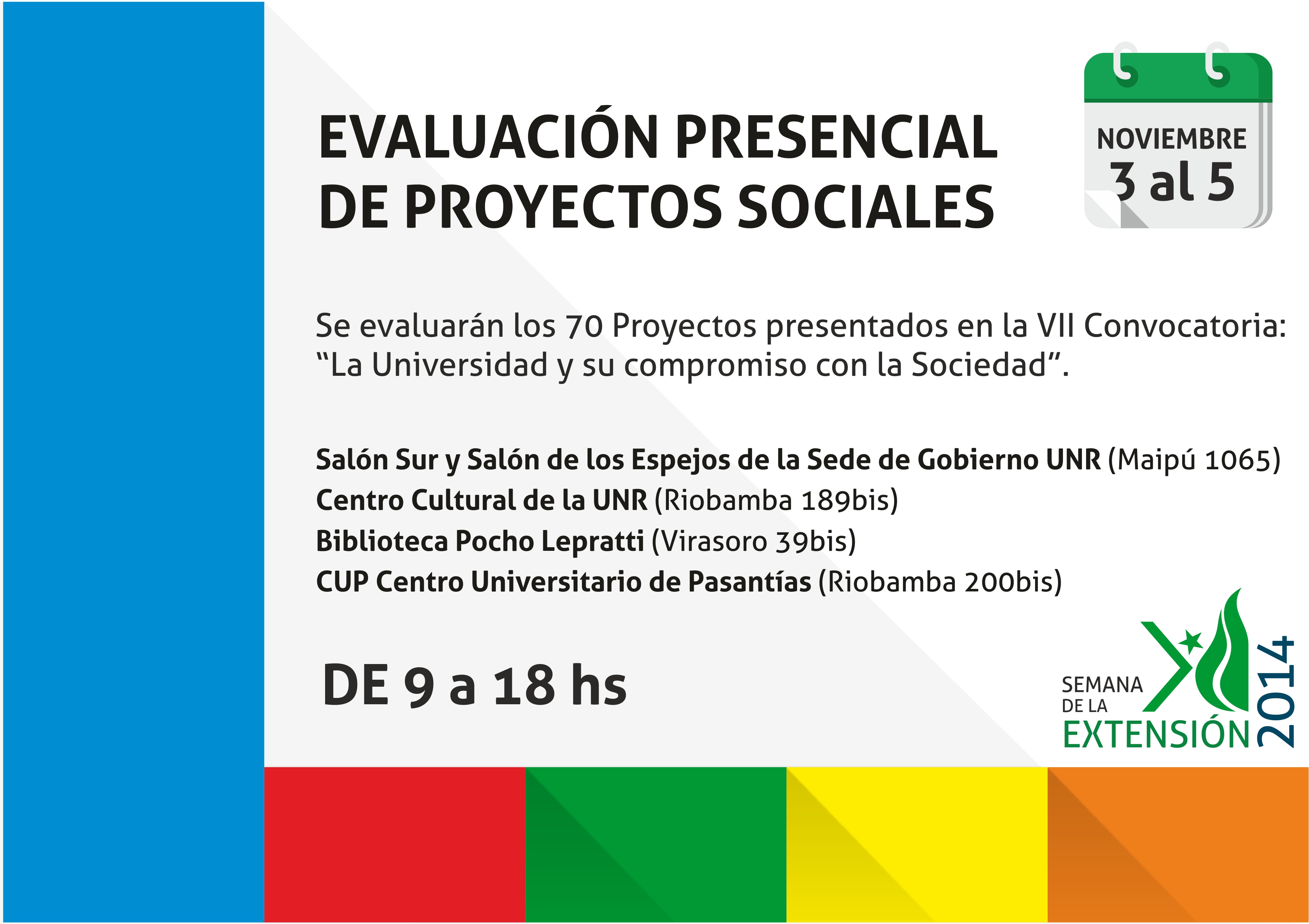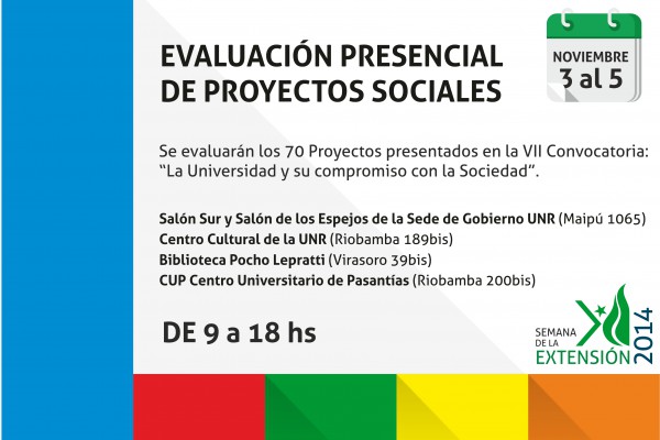 La Secretaría de Extensión Universitaria de la Universidad Nacional de Rosario a través del Área de Proyectos Sociales llevará a cabo una nueva instancia de Evaluación Presencial de Proyectos de Extensión en el marco de la “Semana de la Extensión 2014” . Las mismas tendrán lugar desde el lunes 3 hasta el miércoles 5 de noviembre en cuatro sedes: Sede Gobierno de la UNR (Maipú 1065), la Biblioteca Popular Pocho Lepratti (Virasoro 39 Bis), el Centro Cultural UNR (Riobamba 189 Bis) y el Centro Universitario de Pasantías (Riobamba 175 Bis) como lo indica el Cronograma de Actividades de la Semana.