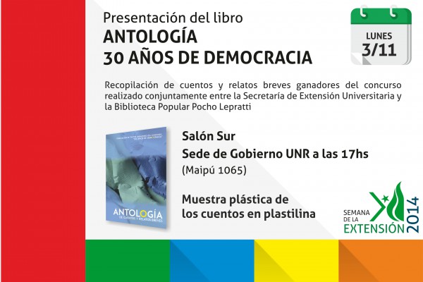 El Área de Comunicación y Difusión Interna de la Secretaría de Extensión Universitaria (SEU) de la UNR realizará la presentación del Libro “Antología, 30 años de Democracia” en el marco de la “Semana de la Extensión 2014”. La misma tendrá lugar en el Salón Sur de la Sede de Gobierno de la UNR, Maipú 1065, el lunes 3 de noviembre a las 17 hs con entrada libre.