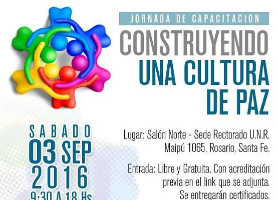 La Secretaría de Extensión Universitaria de la Universidad Nacional de Rosario (UNR) y la Fundación “No Más Violencia Argentina” organizan conjuntamente el encuentro “Construyendo una cultura de paz” una jornada de capacitación con personalidades que intervendrán con temáticas relacionadas a la cultura, la prevención y la identidad. La misma tendrá lugar en la Sede de Gobierno de la UNR el sábado 3 de septiembre de 9.30 a 18 hs.