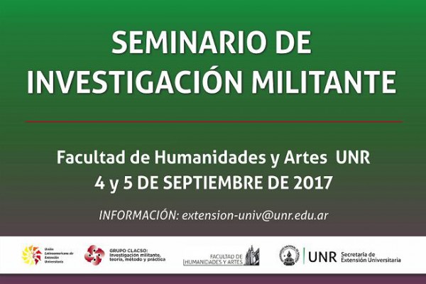 ENCUENTRO DE EXTENSIÓN: La Secretaría de Extensión Universitaria de la Universidad Nacional de Rosario (UNR) conjuntamente con la Unión Latinoamericana de Extensión Universitaria (ULEU), desde su Oficina Sur representada por la UNR, el Grupo CLACSO de Investigación Militante, Teoría, Método y Práctica y la Facultad de Humanidades y Artes (UNR) informan que los días 4 y 5 de septiembre del presente año se llevará a cabo el “Seminario de Investigación Militante” en la mencionada unidad académica de la ciudad de Rosario. Entrada gratuita para estudiantes e integrantes de Organizaciones Sociales.