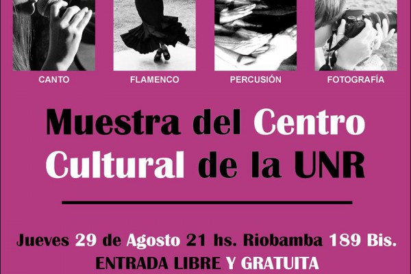 El Centro Cultural de la UNR dependiente de la Secretaría de Extensión Universitaria realizará este jueves una pequeña muestra de parte de sus talleres. El encuentro se llevará a cabo en la sede del complejo cultural, Riobamba 189 bis desde las 21 horas. “Será un espacio para poder disfrutar de los avances que vienen llevando a cabo cada uno de los integrantes de los talleres que tomarán parte del encuentro. Será un estímulo para quienes participan de los mismos en el cual puedan ver reflejados sus trabajos y lo que van aprendiendo con ellos” dijo María Borgobello cordinadora del área.