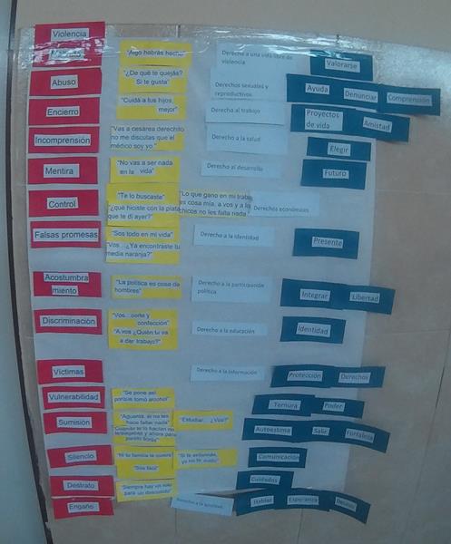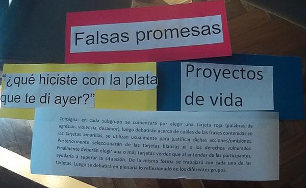 Una de las participantes aseveró “cada persona tiene su personalidad”. Se observó el daño que producen “las palabras como forma de violencia”, desde el insulto y también mediante frases que afectan aún más la subjetividad sin contenerlos. Como ejemplo de estas últimas se tomó una que contenían las tarjetas amarillas “NO TE QUIERE NI TU FAMILIA”.