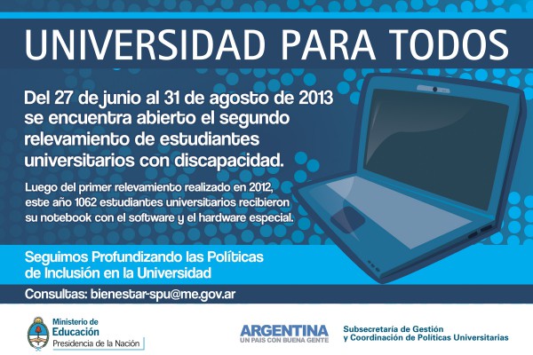 Está disponible el segundo relevamiento de la población estudiantil con discapacidad, que asiste a las Universidades Nacionales Públicas del país. Este relevamiento está orientado a obtener la información necesaria para planificar acciones de equiparación de oportunidades en la población estudiantil.
