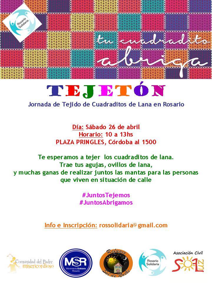 La agrupación Rosario Solidaria convoca al primer TEJETÓN del 2014, una actividad que tiene como finalidad confeccionar cuadraditos de lana tejida de 20 x 20 cm en cualquier color y punto que después serán unidos para armar frazadas que luego serán entregadas a personas en situación de calle.
