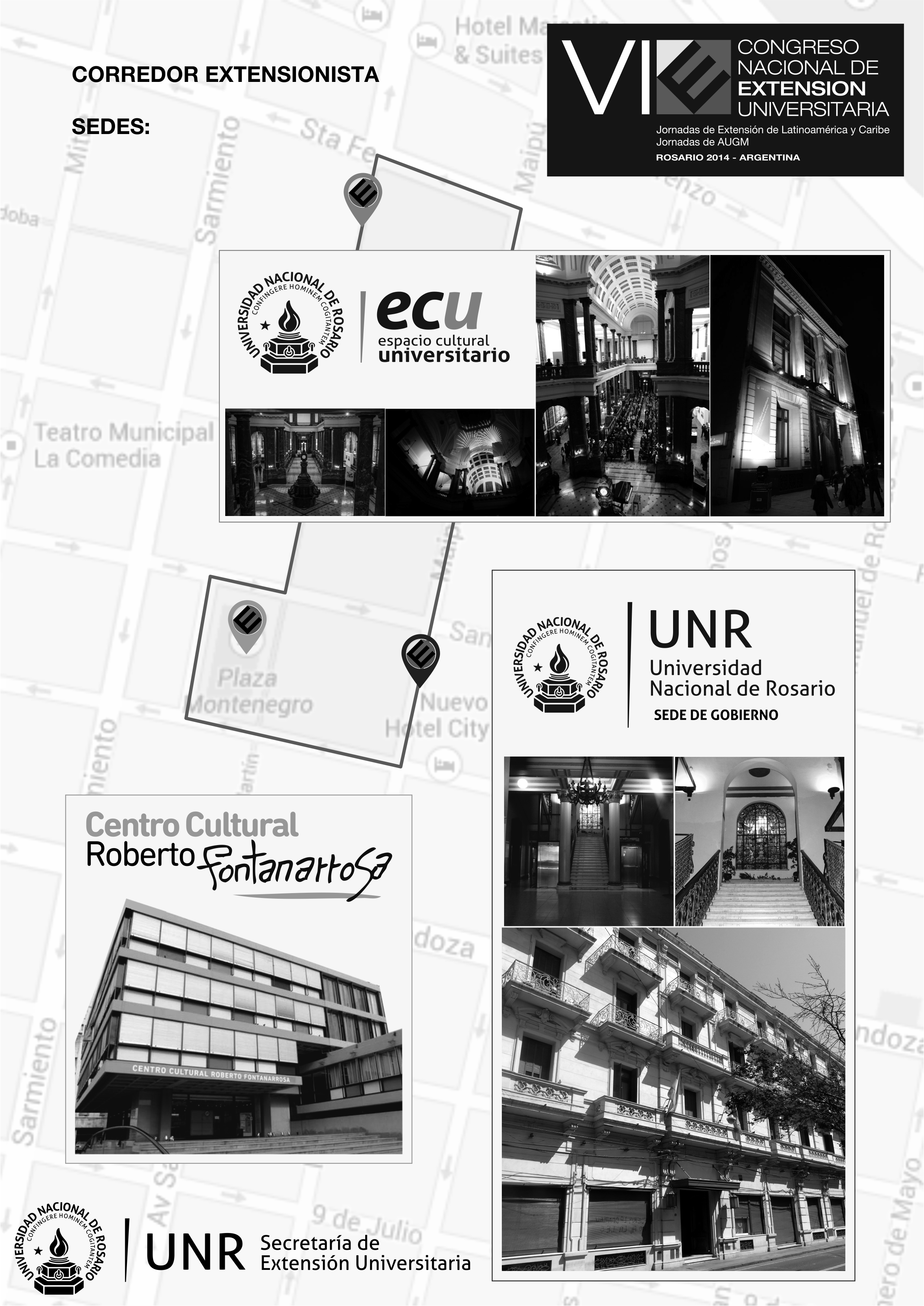 Los distintos eventos del VI Congreso Nacional de Extensión Universitaria Rosario 2014 se desarrollarán en tres sedes que conformarán el denominado “Corredor Extensionista”. Dichos lugares son la Sede de Gobierno de la Universidad Nacional de Rosario (UNR-Maipú 1065), el Espacio Cultural Universitario (ECU – Peatonal San Martín 750) y el Centro Cultural Roberto Fontanarrosa ( CCRF – San Juan y Peatonal San Martín) ubicados estratégicamente en el centro de la ciudad de Rosario en un radio de 600 metros.