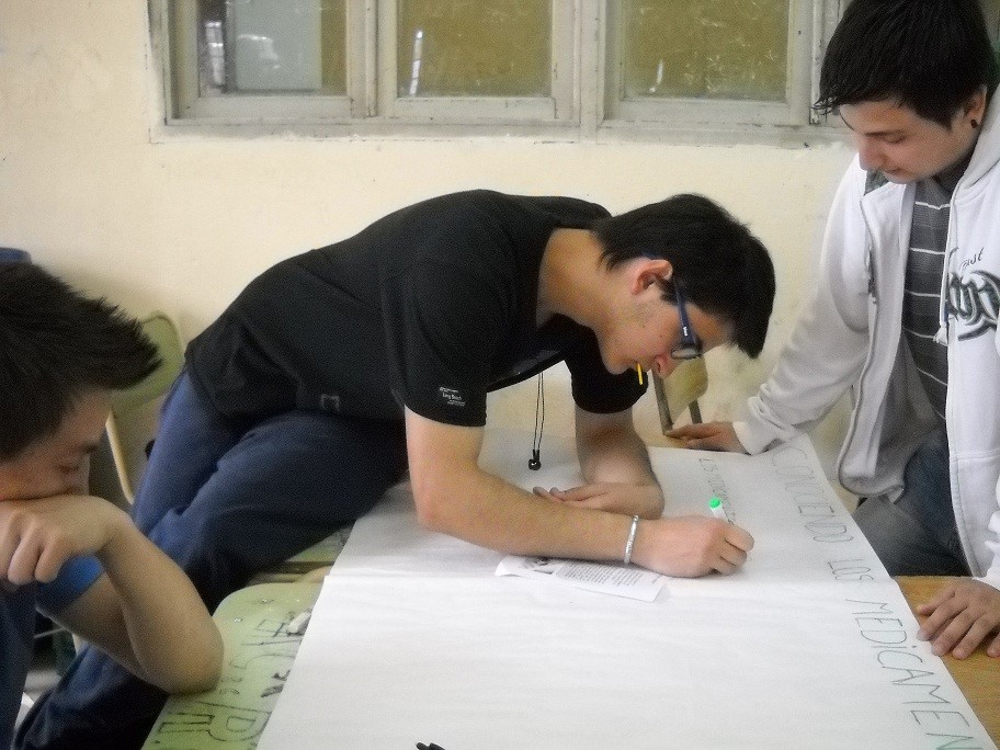 Durante su dictado se abordaron temas relacionados al conocimiento de los medicamentos, los AINES (antinflamatorios no esteroideos), los antibióticos y la resistencia bacteriana y el uso apropiado de los medicamentos. Como parte de la metodología de trabajo, los estudiantes se dividieron en pequeños grupos, al que cada promotor les explicó los objetivos del taller y las dinámicas que iban a utilizarse. A cada estudiante se le entregó folletos (trípticos) en los cuales se destacaban los puntos claves más importantes sobre el tema que iban a ser tratados en los talleres. Además, se utilizaron dos tipos de dinámicas de animación. Una de ellas denominada mitos y verdades, donde a los participantes se les presentaron impresas en papel, distintas afirmaciones que los estudiantes debían leer y colocar en una de las dos cajas disponibles, la de las verdades o la de los mitos. Luego, cada una de estas afirmaciones fueron revisadas y discutidas de a una en forma grupal, y con la guía del promotor se corrobora si la clasificación inicial como mito o verdad había sido correcta o no.