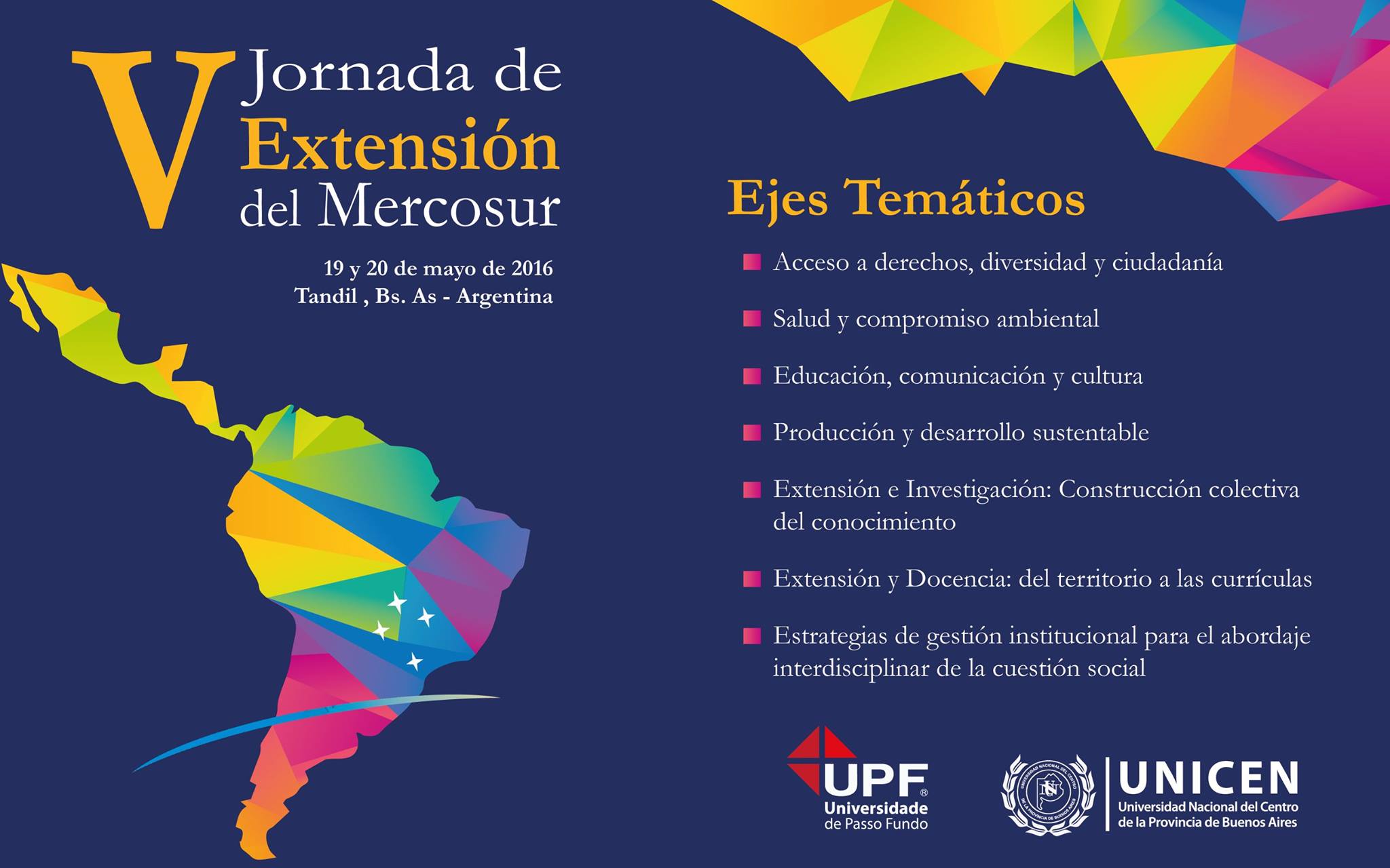La Universidad Nacional del Centro de la Provincia de Buenos Aires (UNICEN) es sede de las V Jornadas de Extensión del Mercosur a desarrollarse durante los días 19 y 20 de Mayo de 2016, en la ciudad de Tandil, provincia de Buenos Aires, República Argentina. Las Jornadas se realizan de manera conjunta con la Universidad de Passo Fundo (UPF), ubicada en el Estado de Rio Grande do Sul, Brasil.